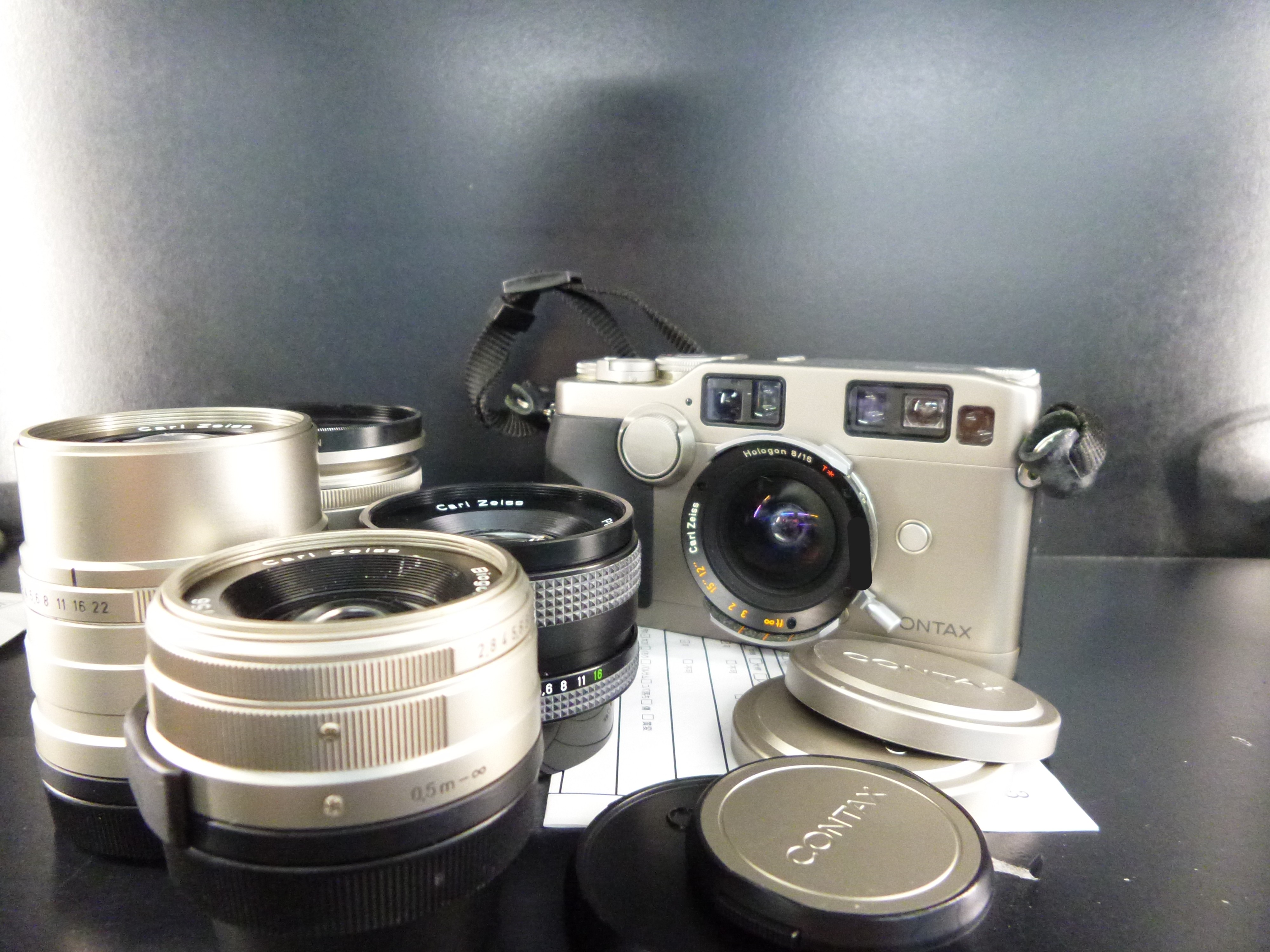 25-3「CONTAX G2 / Biogon 21mm F2.8/ Sonnar 90mm F2.8 / Biogon 28mm F2.8 / Planar 50mm F1.7 MMJ / Hologon 16mm F8」です!レンズが5個もついてます。